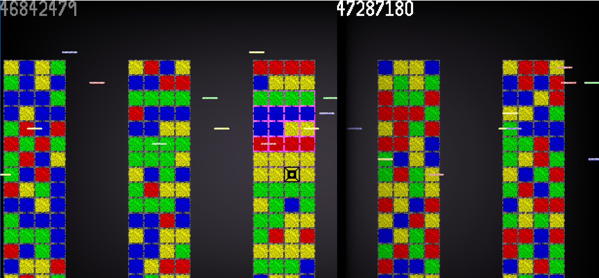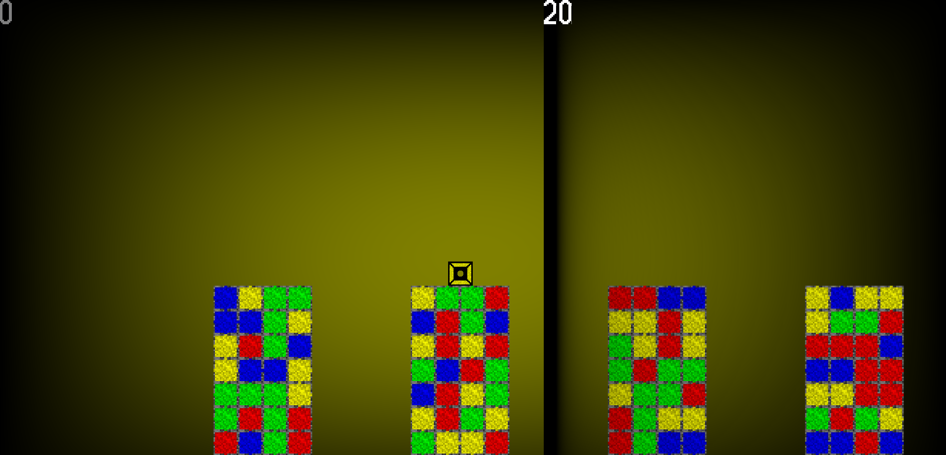 The idea is that you jump from pillar to pillar, matching different cubes as you go. You always have a color, your color determines which color of blocks you can pass through, while all of the other ones are solid. When you match 3 colors, they become the color that you are. Your score increases with each match, and increases more the further to the right you are.