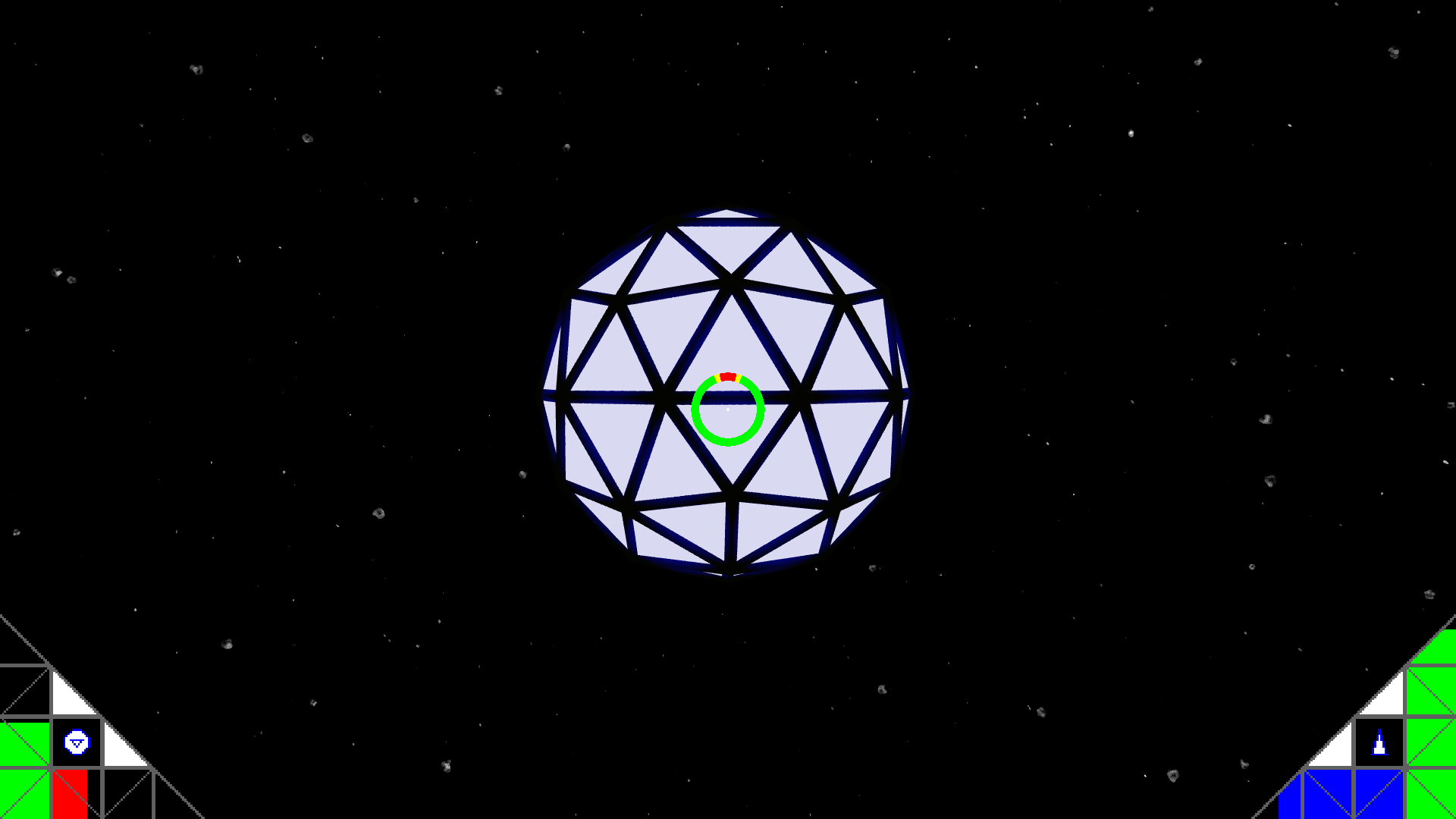You control a drone that defends a transport ship. You also need to collect energy from the asteroids coming at you, and give it to the transport ship so it doesn't run out of energy.